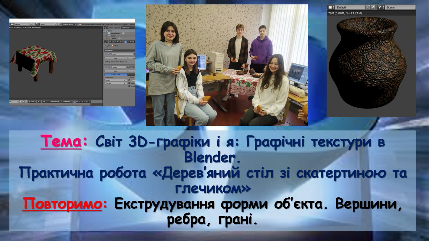 9а-класники моделювали засобами 3D-редактора Blender дерев'яний стіл, накладали на нього відповідну текстуру, скатертину з маками, глечик з глиняним матеріалом. А на справжній скатертині їх чекали смаколики - пиріжки, як нагорода за плідну працю.